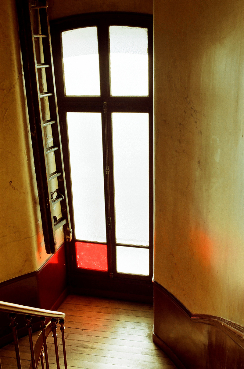 Immeuble, peinture acrylique sur verre, lumière du jour.