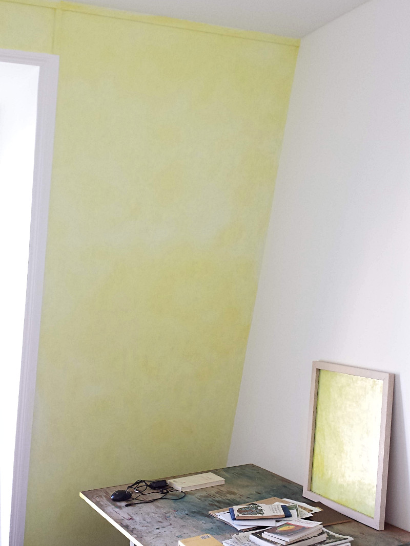 Peinture à l'huile jaune citron sur mur, miroir et bord de table.