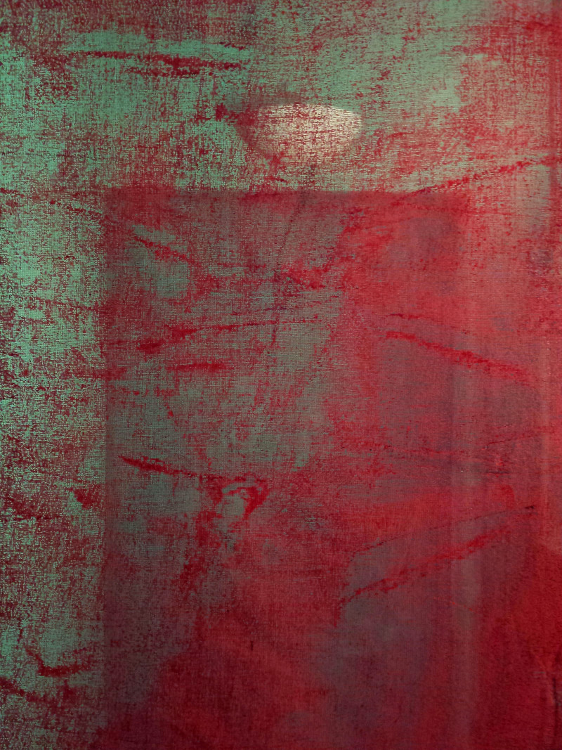Dans la douche. Peinture à l'huile sur soie, peinture à l'acrylique sur mur et sur coton.