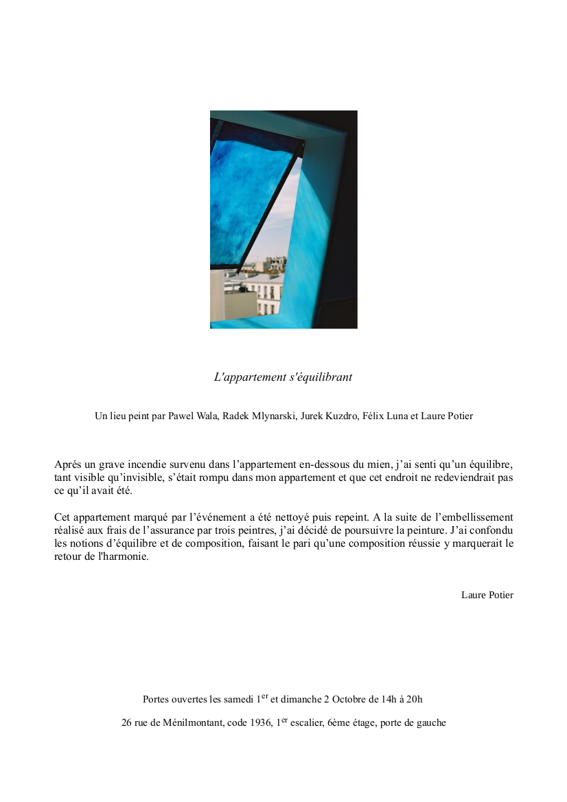 Les 1er et 2 octobre 2016, j'organisai des portes ouvertes pour présenter le projet de l'appartement peint à mes voisins et amis. J'invitai ces personnes à visiter entièrement l'appartement et à le regarder comme s'il s'était agit d'une seule grande peinture déployée dans cet espace clos, sur toutes ses surfaces. Comme si cet appartement avait été une nature morte vivante.