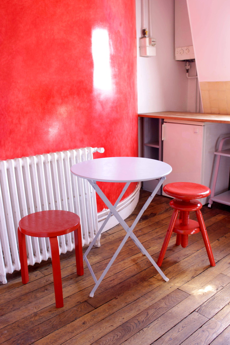 Peinture vinylique sur tabourets. Peinture acrylique sur table. Peinture à l'huile sur mur. Vernis sur le tout.