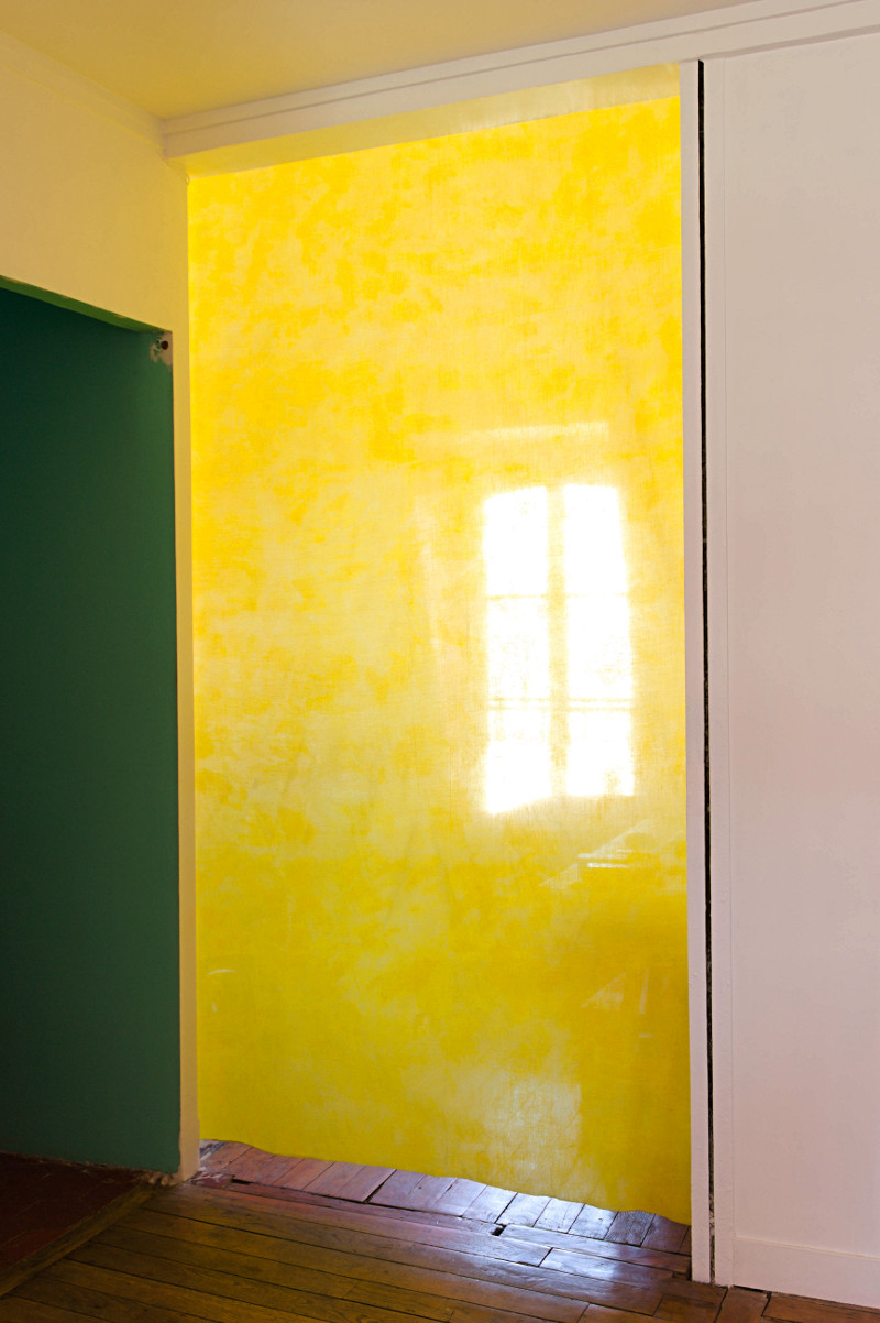 Peinture acrylique "Salles de bain et cuisines" vert d'eau et peinture acrylique blanche sur mur, peinture pour textile jaune citron sur voile de coton.